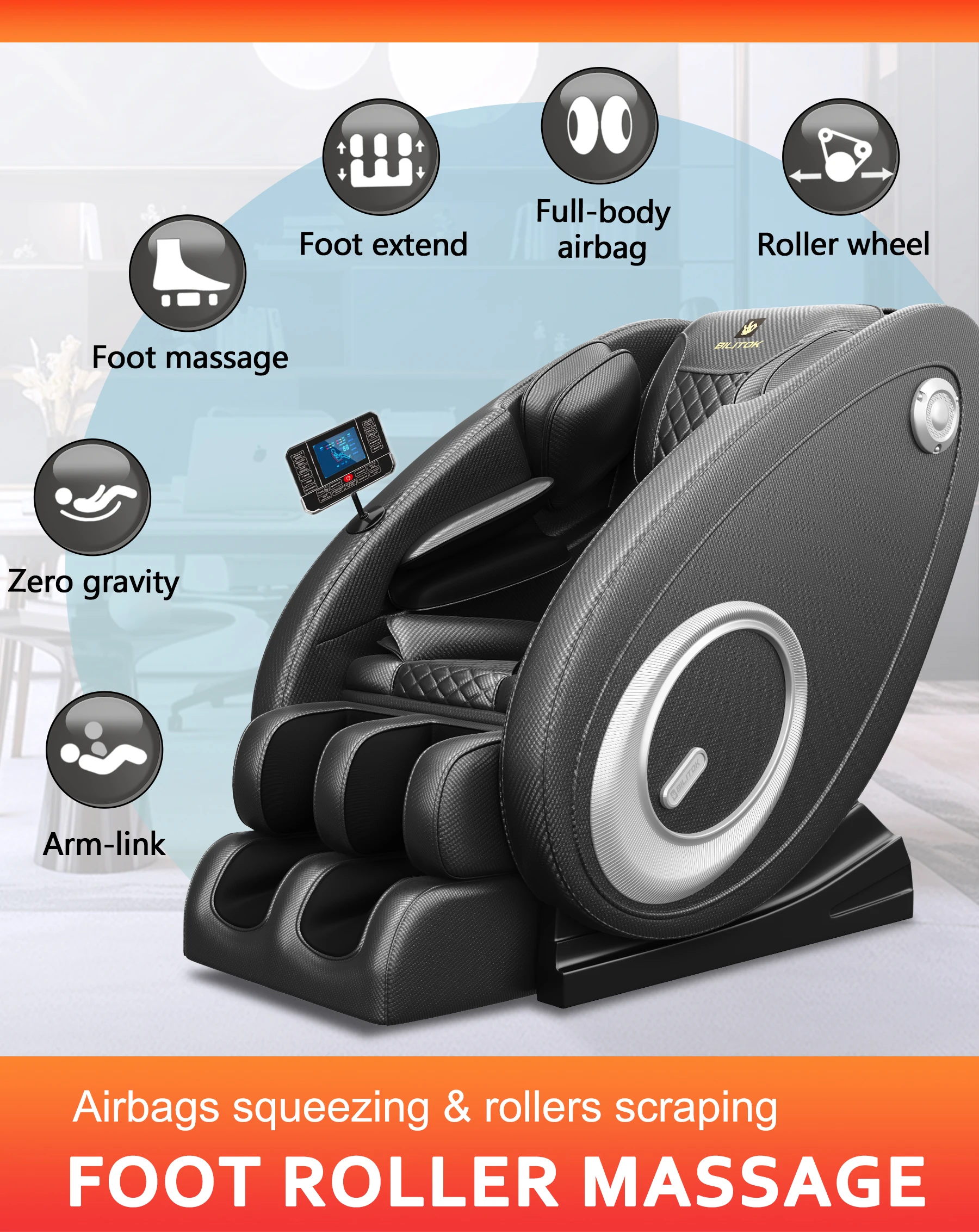 Eight fixed rollers on the back provide massages for the back and waist. Airbags on the shoulders, arms, hips, and calves can inflate or deflate, relieving tension and muscle fatigue. Press the "Zero Gravity" button for a fully reclined position, elevating your feet above the heart to reduce cardiac stress and enhance your overall experience. -