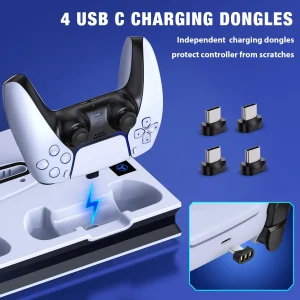 - 【A RELIABLE PS5 SLIM VERTICAL STAND】 Four Type C charging dongles meet your needs and protect the controller shell from scratches. Simply insert a dongle into controller’s charging port, and PS5 controller will rest easily in the ps5 charging dock and begin charging instantly. The ps5 slim cooling stand has a premium intelligent chip to ensure safe charging. It provides Short-Circuit/Over-Charge/Over-Current/Over-Voltage/Over-Heat Protection to maximize the lifespan of your equipment